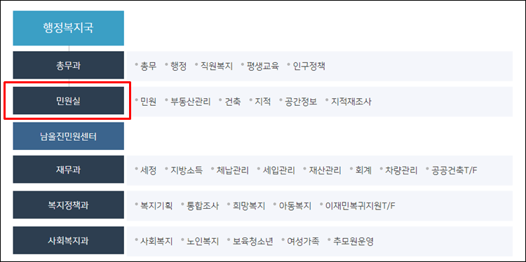 해당메뉴에서 군청안내의 조직도를 눌러 보시기 바랍니다.