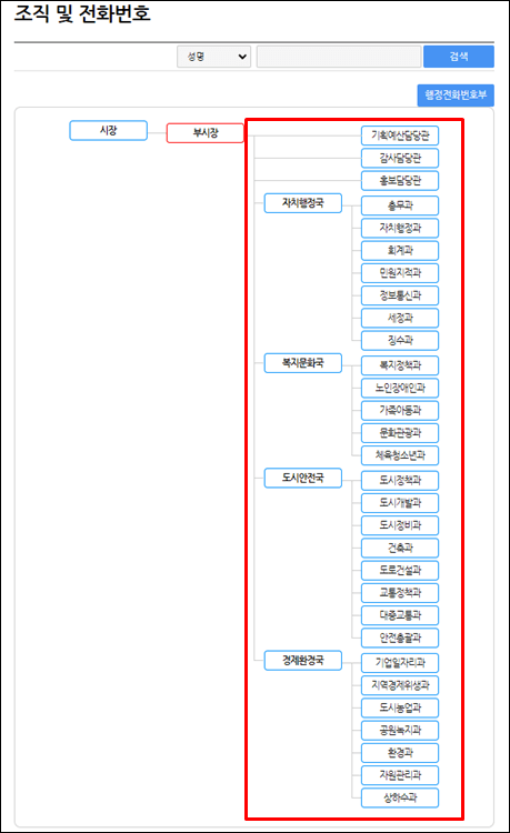 각 부서명을 선택하시면 부서 직원과 전화번호를 확인하실 수 있습니다.