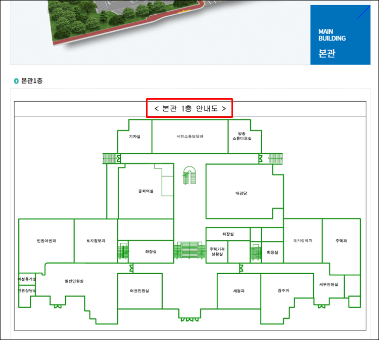 방문하기 전 청사안내도를 살펴보시고, 어느 부서가 어디에 있는지 살펴보고 가시기 바랍니다.
