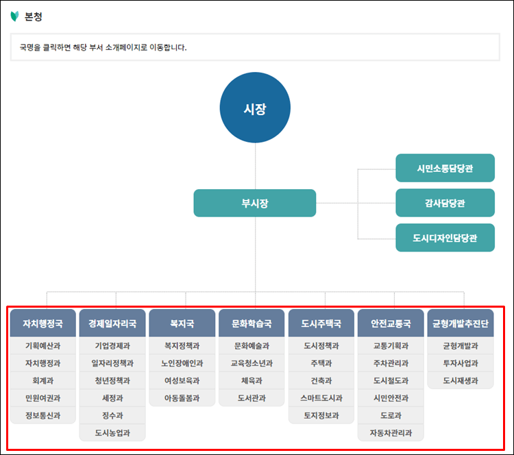- 안전교통국 : 교통기획과, 주차관리과, 도로과 등이 있습니다.