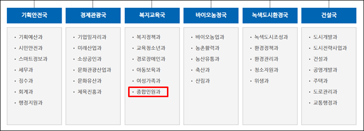 - 복지교육국 : 복지정책과,교육청소년과,경로장애인과,아동보육과,여성가족과,종합민원과