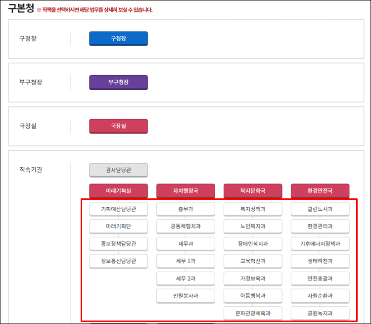 - 미래기획실 : 기획예산담당관, 미래기획단, 홍보정책담당관, 정보통신담당관