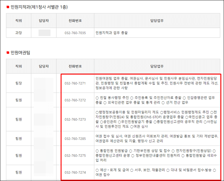 3. 인천중구청 직원 및 전화번호 확인하기