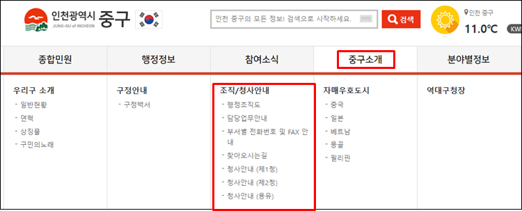 인천중구청 홈페이지 직원 및 전화번호
