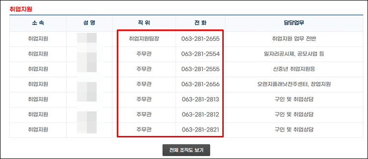 그럼 아래와 같이 소속, 성명, 직위, 전화, 담당업무를 알아보실 수 있습니다.