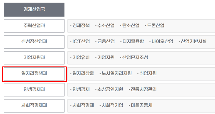 만약 일자리 정책에 관심이 있으시다면 일자리정책과를 클릭하시면 됩니다.