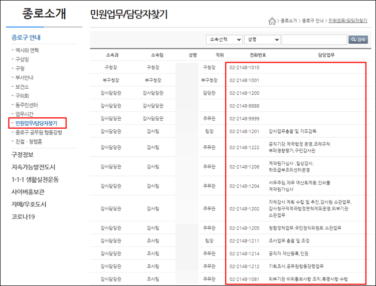 오늘은 종로구청 홈페이지에서 조직도와 전화번호를 조회해 보았습니다.