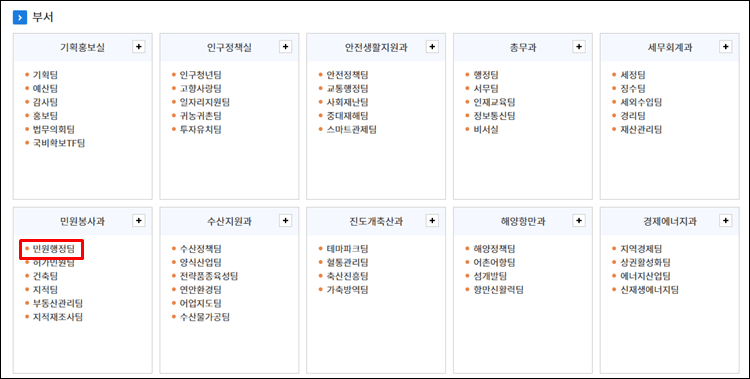 원하시는 부서를 클릭하시면 전화번호를 볼 수 있는데, 대개 민원봉사과에서 많은 업무를 보곤 합니다.