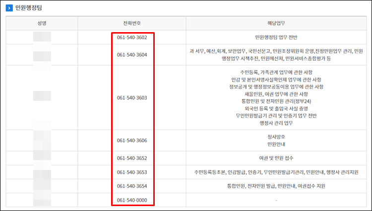 따라서 민원행정팀을 클릭해서 직원과 전화번호를 조회해 보도록 하겠습니다.