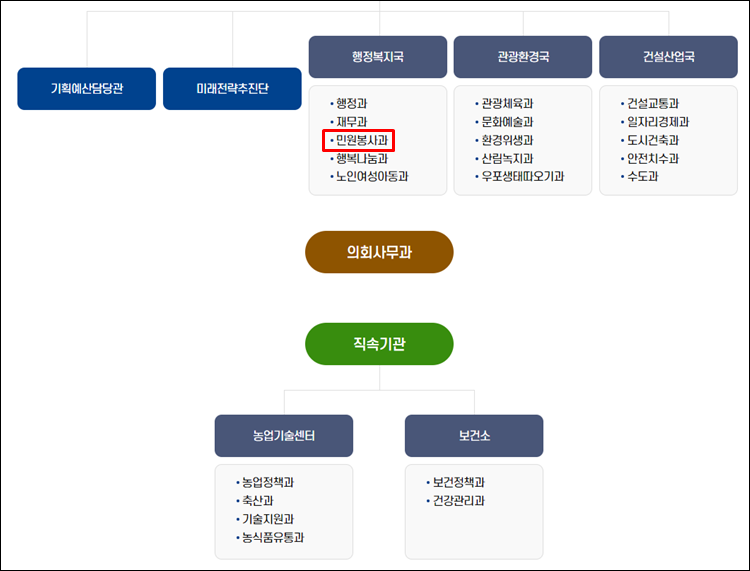 - 행정복지국: 행정과,재무과,민원봉사과,행복나눔과,노인여성아동과