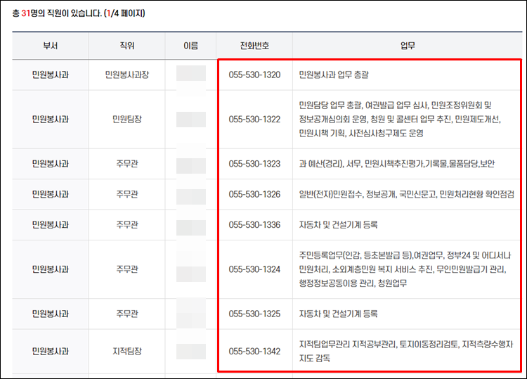 민원봉사과를 살펴보시면 아래와 같이 31명의 직원이 있습니다.