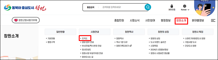 창원소개 메뉴에서 시청안내의 조직도를 클릭해보시기 바랍니다.