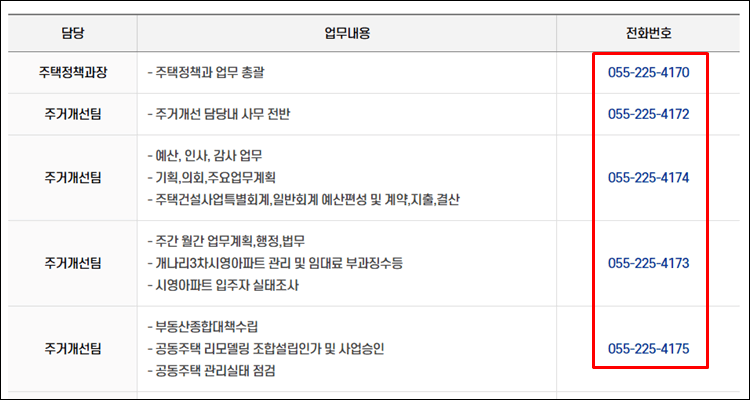 창원시청의 주택과를 선택하면 아래와 같이 업무내용과 전화번호를 보실 수 있습니다.