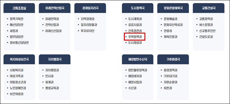 - 해양항만수산국 :항만물류정책과, 해양레저과, 해양사업과, 수산과