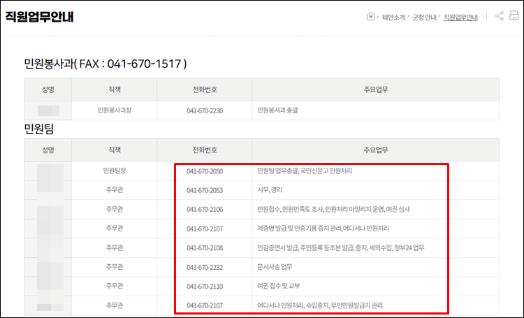 3. 태안군청 직원 이름 및 전화번호 바로가기