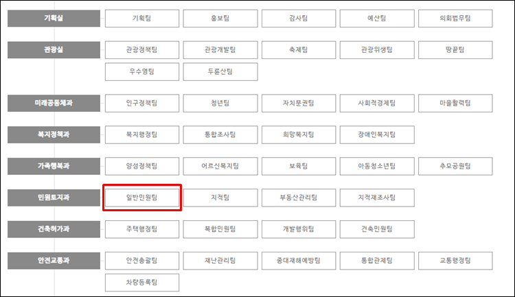 - 민원토지과 : 일반민원팀, 지적팀, 부동산관리팀, 지적 재조사팀