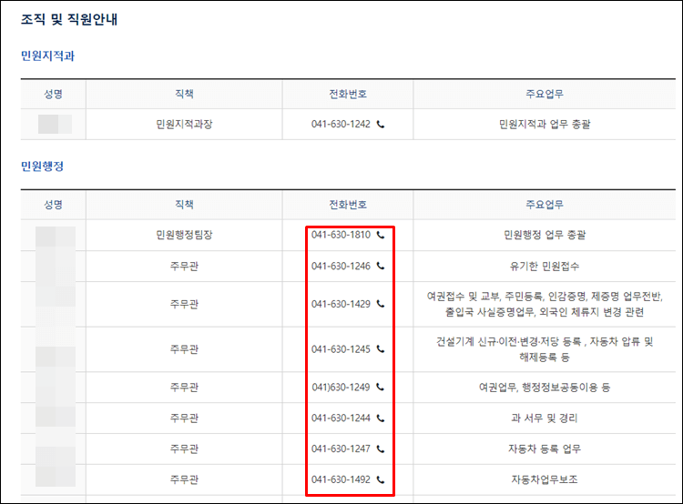 직원 전화번호는 물론 성함과 주요 업무까지 확인해 보실 수 있습니다.