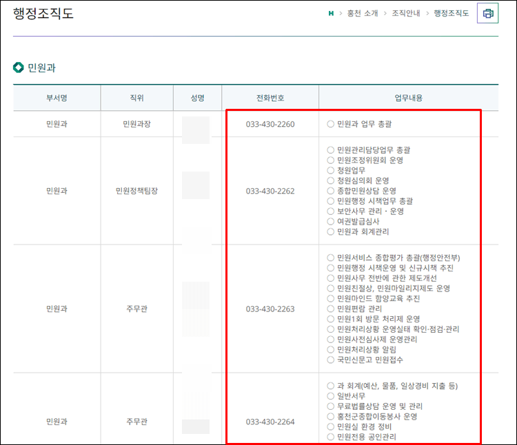 아래와 같이 홍천군 민원과의 부서, 직위, 성명, 전화번호, 업무내용이 한 번에 조회되는 것을 보실 수 있습니다.