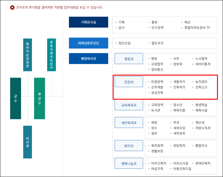 가장 많은 민원업무를 담당하는 민원과를 클릭해 보도록 하겠습니다.